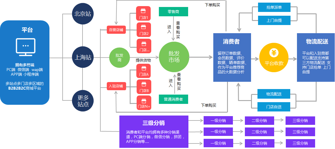 ShopSuite多商户商城平台系统结合“入驻—供货—采购—分销”的四位一体思路,从平台到站点到供货商供货,从商家入驻到网点区域配送,再到终端顾客,形成一个完整的电商生态模式。